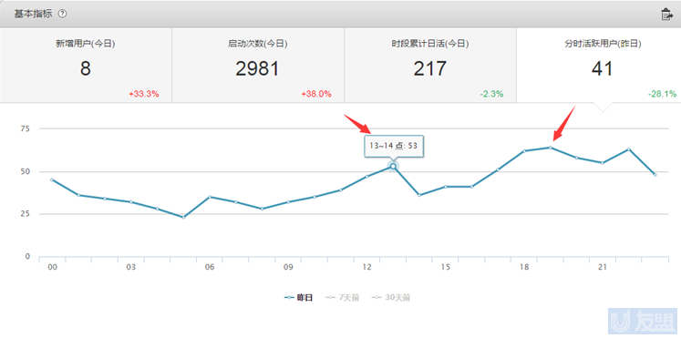 比如,从友盟统计后台来观察,每天用户的活跃高点集中在下午 1 点 - 2 点和晚上的 19 - 20 点,那么可以选择这两个时间段来发送消息。